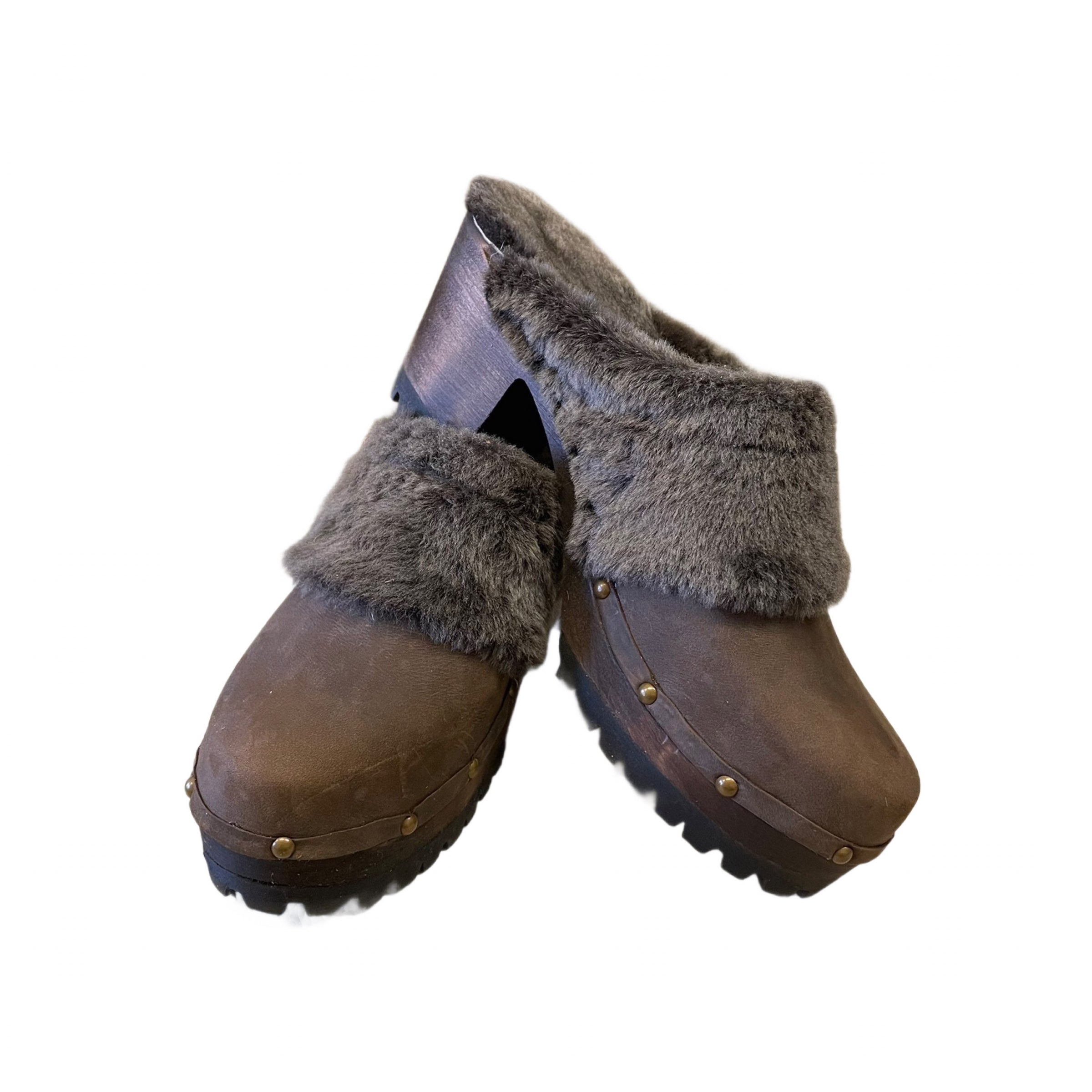High Heel Mountain Yura in a Chocolate Leather on a Brown Stained Sole with a Wide Cuff and Insole of soft, silky Brown Shearling, finished with decorative nails. Wood base with polyurethane sole. Front base 1 1/4" Heel 3". THESE CLOGS RUN SMALL - ORDER 1 SIZE BIGGER than your normal sizing - sizing chart below reflects how you should order.