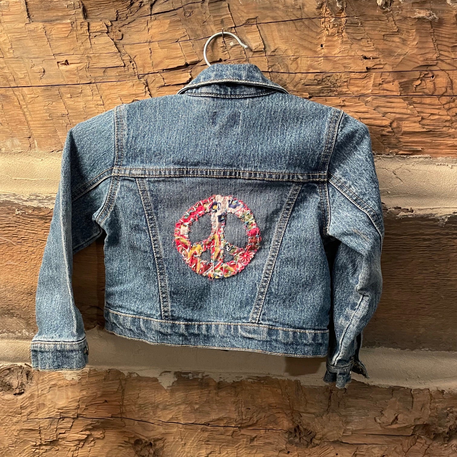 Upcycled Jeans Jacket embellished with a variety of Patches, Vintage Fabric, Velvet, Lace, Embroideries, Ribbon, Fringe, Buttons and Stitching.